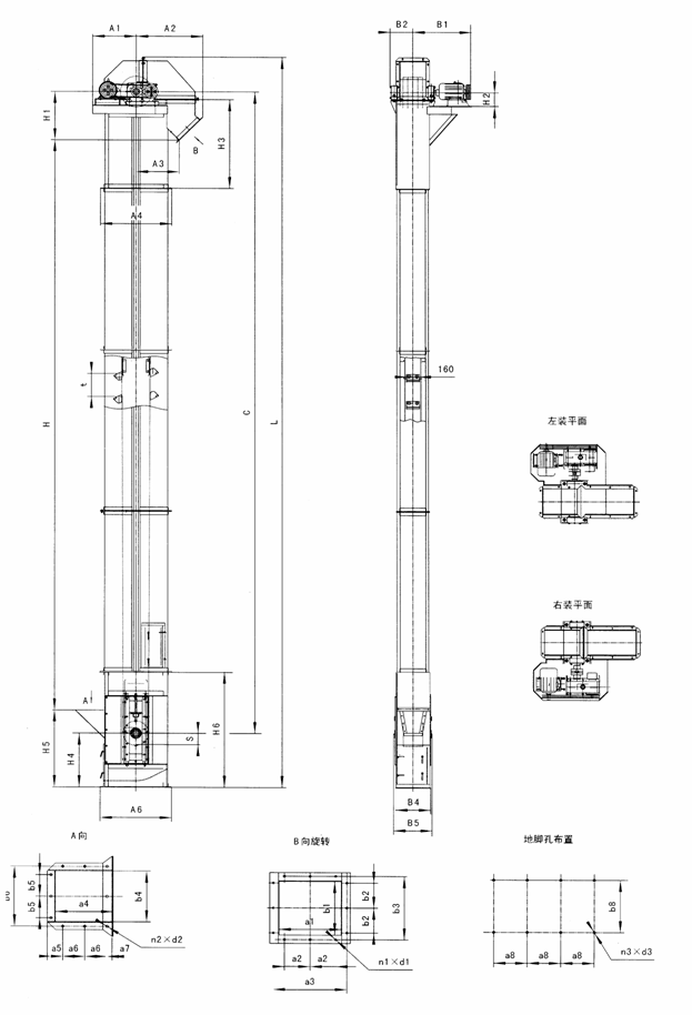 TD型斗式提升機(jī)的外形及安裝尺寸: