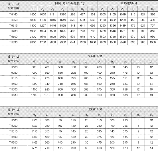 注:1、表中斗容是計(jì)算斗容(料斗盛水時(shí)的容積),輸送量是按填充系數(shù)為1時(shí)計(jì)算所得,實(shí)際應(yīng)用時(shí)要考慮填充系數(shù)。2、表中改進(jìn)型只有TH315、TH400、TH500、TH630。